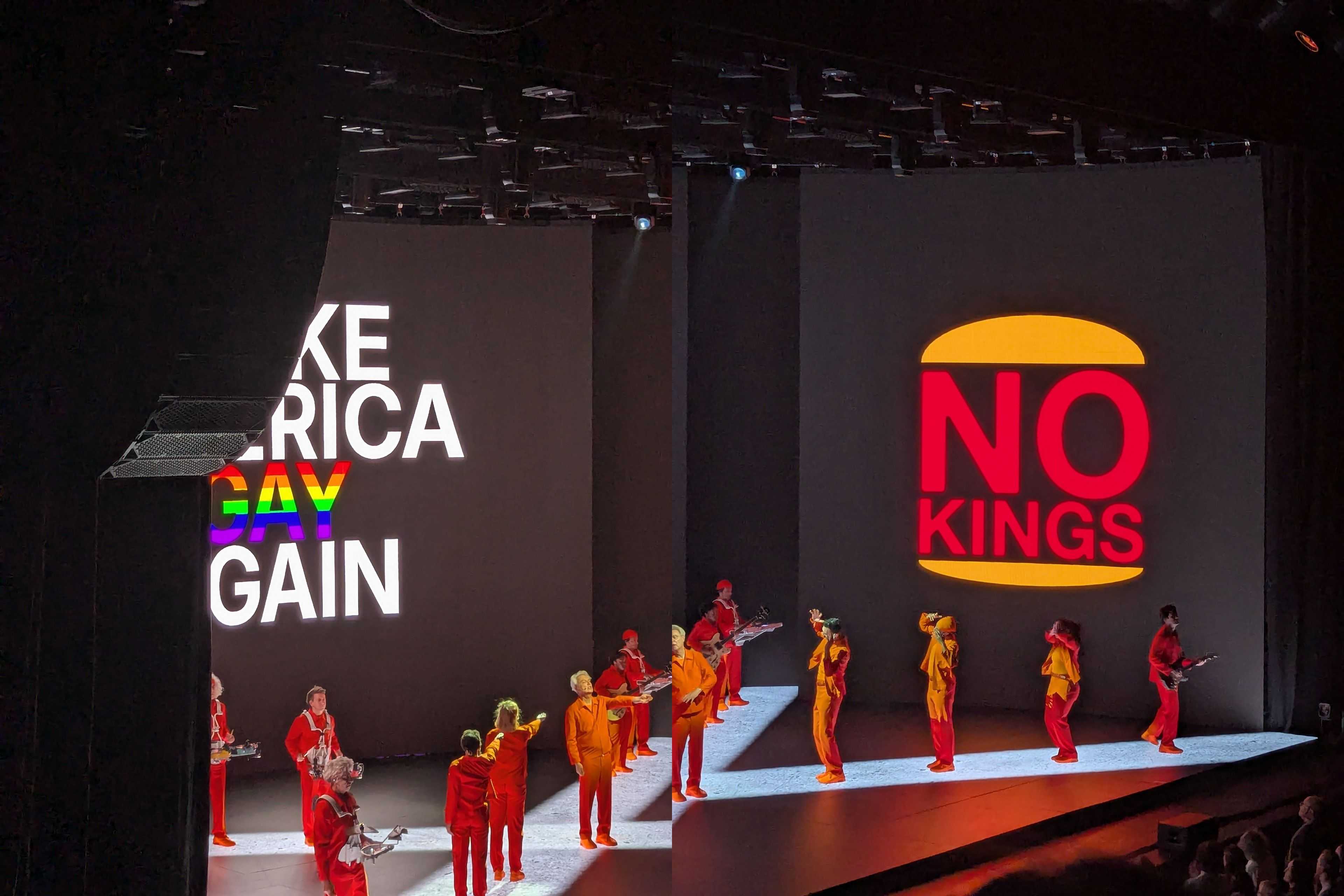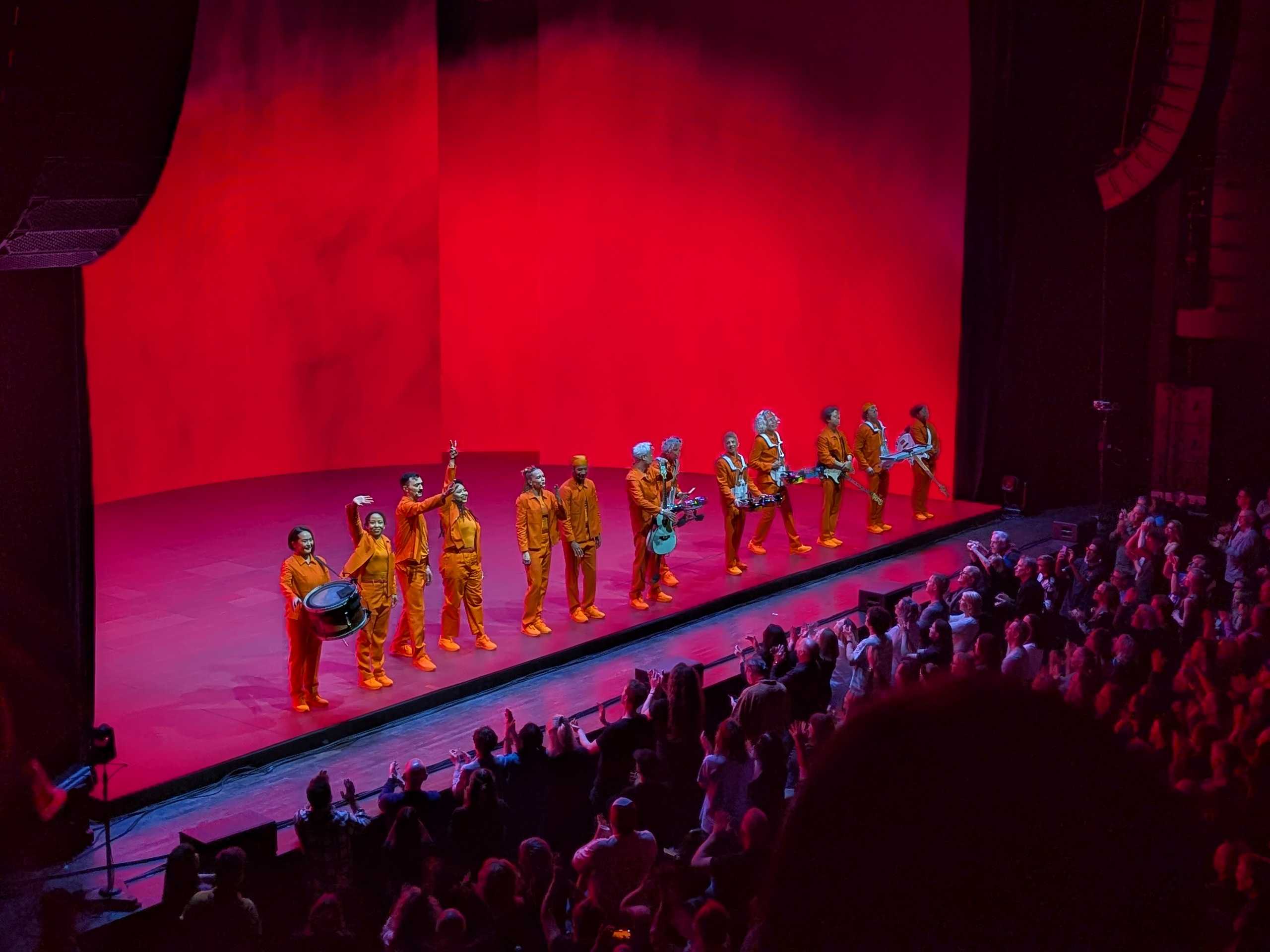 So we went to see David Byrne on tour. Dude’s in his seventies, and his show involves him and the entire ensemble moving around the stage for a full two hours. All the musicians have to carry their instruments, including the drummers, and they’re not excused from the choreography. It was kinda funny to see Byrne and a few other older musicians on stage, while everyone else was much, much younger. The walls and floor were giant screens, and there was software to track the positions of the performers and tweak the video feeds in real time. It was very impressive, in a way that unfortunately isn’t caught all that well in still images.